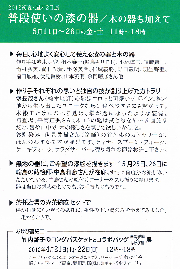 【企画展】「2012初夏・週末2日展」普段使いの漆の器 / 木の器も加えて